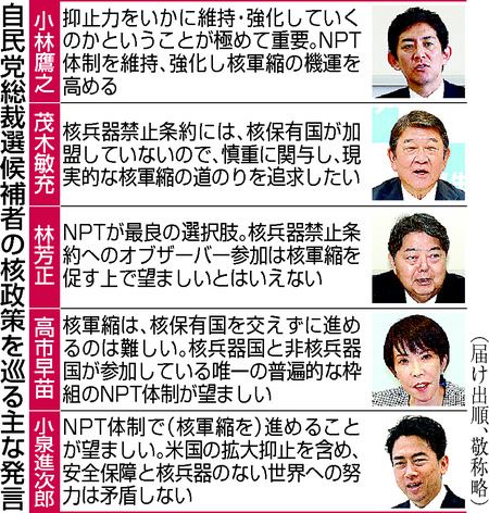 永田町発 自民総裁選 5候補の政策 <上> 核禁条約 5人消極的 防災庁は設置で一致