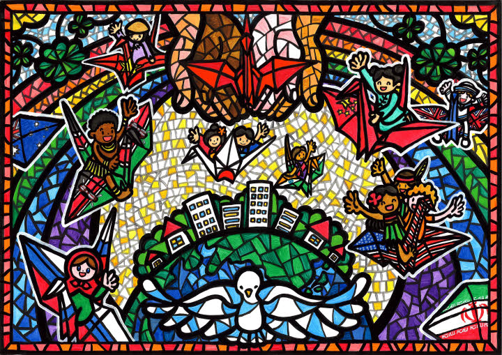 山田さんは、肌の色や文化の異なる人々が日本や米国、中国などの国旗の模様の折り鶴に乗った様子をステンドグラス風に描いた。地球やハトもあしらい、平和を願う人々の心に国境はなく虹の橋でつながっている様子を表したという。