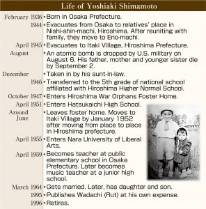 Yoshiaki Shimamoto, 89, a former music teacher living in Kawanishi, Hyogo Prefecture, lost his family in the atomic bombing and became an orphan. During his junior high school years, he stayed at the Hiroshima War Orphans Foster Home in present-day Saeki Ward. It was then that he was put in touch with a person he came to adore as his “mother.”