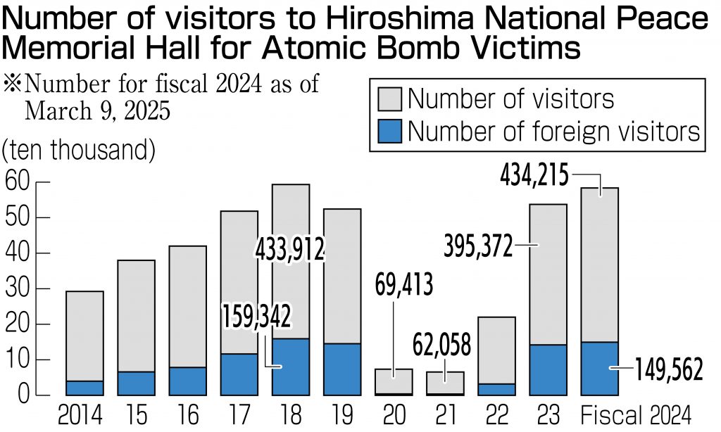 The Hiroshima National Peace Memorial Hall for the Atomic Bomb Victims, located in the city’s Naka Ward, announced March 10 the number of visitors to the hall in fiscal 2024, which ends at the end of this month, had reached 434,215 as of March 9, the highest number since the hall opened in fiscal 2002. As factors behind this increase, the hall cited a sense of crisis that peace is being threatened by an unstable world situation and the summit of the Groups of Seven industrial nations held in Hiroshima in 2023.