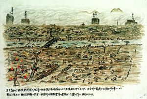 其(そ)の間を男女の判別もつかない程焼けただれた身体を僅(わず)かに腰の辺りをかくす程度のボロ切れに包まれた怪物?がうろついて居る。怪物としか思はれない其の姿だ。顔は眞(っ)黒焦(げ)、同じ両手を胸の辺りに支へて、僅かに開いた両眼(め)で自分等を見つけて「水を頂戴(ちょうだい)」と哀願して居る。これでは親兄弟が一寸(ちょっ)と見ただけでは判別はつかないであらう。彼等は自らの家に帰る事がわからないのであらうか、いつこう帰らうとしない。或る者は腰を地に下ろして何か考へて居るのか救助を待つのか、将又(まさにまた)死の手を待つか動こうとしない。(中略)