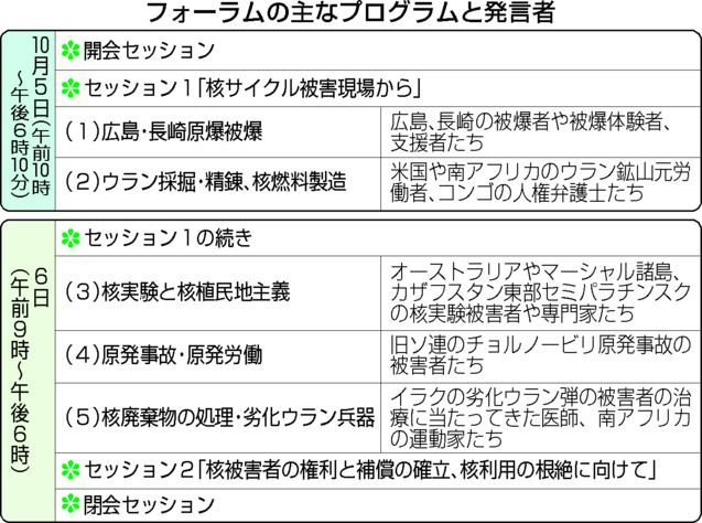 国内からは広島、長崎の原爆や、東京電力福島第1原発事故の被害者が登壇する。第1部では、それぞれが受けた被害を報告。第2部で、被害者の権利確立や補償の方策を話し合う。「広島・人権宣言」採択も目指す。