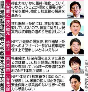 残る3人は米国の「核の傘」による抑止力にも言及。小泉進次郎農相は「米国の拡大抑止を含め、日本の安全保障と核兵器のない世界への努力は矛盾しない」。小林鷹之元経済安保相は「現実的な実効性のあるものを進めていくのが基本。抑止力をいかに維持・強化するかは極めて重要」と訴えた。