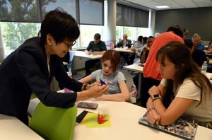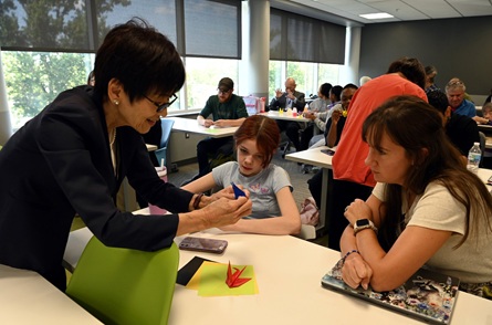 使節団は、核兵器廃絶への行動を呼びかける広島市の松井一実市長の手紙も同大へ届けた。石川さんのほか、被爆2世たち使節団のメンバー3人も折り鶴のワークショップなどを通じ、平和への思いを共有した。