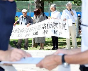 9月下旬。残暑厳しい広島市中区の平和記念公園に被爆者たちの姿があった。広島県被団協(箕牧(みまき)智之理事長)など、被爆者7団体のメンバーたち。政府に核兵器禁止条約への参加を迫るため、4年前から2カ月に1度、街頭署名に立つ。