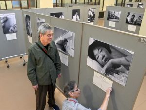 自らの名を懸命に書く20歳代の女性、障害者施設でニワトリの世話に励む男性…。小さな頭を隠せるようにとパーマをかけた女性が食事をする様子もある。1960~70年代に重田雅彦さん(81)=安佐北区=と菅沼清美さん(78)=横浜市=が撮った約8千点から主催者側が選び、3日、会場に展示した。