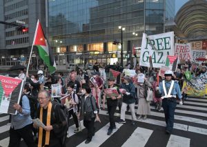 参加者はJR広島駅前(南区)から本通り商店街(中区)を経て、原爆ドーム前(同)までの約3キロを約1時間半かけて歩いた。「FREE GAZA」と書かれた横断幕を掲げながら、「即時停戦」「パレスチナ解放」などと声を上げた。