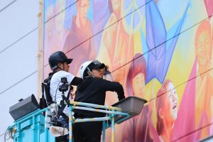 世界25カ国以上で壁画を描いてきたアドリー・デル・ロシオさん(41)と弟カルロス・アルベルトGHさん(39)。空港近くに滞在し、高所作業車に乗ってペンキで色鮮やかに仕上げている。