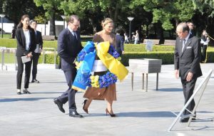 松井一実市長から被爆当時の状況などの説明を受けながら原爆ドームを視察。国旗の色と同じ青と黄の花輪を原爆慰霊碑に供えて黙とうした。原爆資料館を石田芳文館長の案内で、約1時間にわたって見学した。