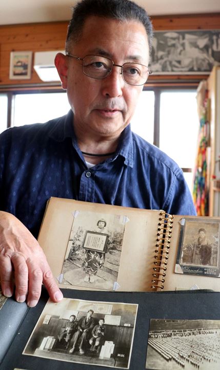 「便利な道具もない時代。暮らしの知恵を感じる」。広島市中区の細川洋さん(66)はセピア色の写真に目をやり感慨深そうに語った。緊張した面持ちの男児の背後に、かまぼこ板にくぎを均等に打った「魚のうろこ取り機」の絵が写る。この男児は父浩史さん(2023年に95歳で死去)だ。