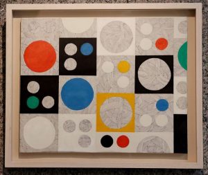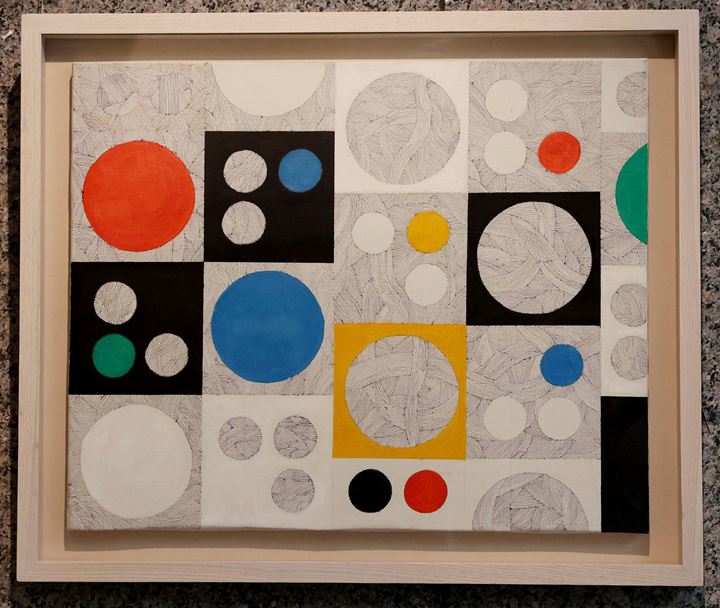 香川さんは、広島大教育学部で美術を学んだ後、教壇に立ちながら活動。一貫して抽象表現を追い求めた。今回展示する「Work2016―01」(2016年)は、丸と四角、直線で構成。赤、黄、青といった鮮やかな色面に描く喜びが息づき、背景に描き込んだ細やかな模様に繊細さがのぞく。