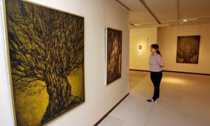 広島拘置所(中区)の巨大壁画制作でも知られる入野さん。武蔵野美術学校(現武蔵野美術大)西洋画科で学び、1975年に初期の代表作「裂罅(れっか)」で現代日本美術展大賞を受賞した。今展では、晩年の「精霊」シリーズ(2009~13年)を展示。縄文杉や大イチョウなどの巨樹が傷みながら生き続ける姿に、戦後も続いた被爆者たちの闘いが重なる。