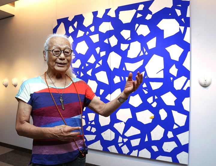 田谷さんは基町高(中区)3年の時、プロレタリア詩人だった父親の勧めで画家の福井芳郎さんに師事。1960年代から新協美術展で活躍し、第1回ヒロシマアートグラント(83年)を受賞した。今展出品の新作「awe」(2025年)は縦2メートル、横8メートルの大作だ。ネオンカラーを思わせる深い青の背景に白い飛び石のような形をランダムに配置。紙粘土で作った18種類もの顔を画面の左右に配列し、微々たる表情の変化には生きとし生けるものへの畏怖がこもる。