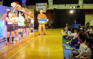 劇団員7人が体育館の特設舞台で、白猫のシュレミールと意思を持った潜水艦のアルムが戦争を終わらせようと奔走する物語を披露した。巧みな手の動きで人形をコミカルに操り、迫真の声色で魅了。児童は笑ったり拍手をしたりして喜んでいた。3、4年生約20人を対象にワークショップもあり、児童は劇の幕あいに潜水艦で海の生物を観察する人形劇に挑戦した。