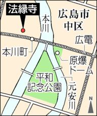 法縁寺には戦後の整地作業で見つかった原爆犠牲者の引き取り手のない遺骨を使った「無縁骨仏(こつぶつ)」があることから、石碑の設置場所に決まった。同寺僧侶の大森顕乗(けんじょう)さん(40)は「ヒロシマを通じて平和を願う気持ちを共通に持つ2人の思いを感じてほしい」としている。(藤村潤平)