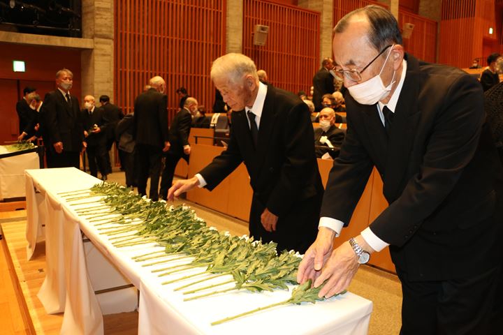 沖縄戦で父を亡くした市遺族会の河野勝美会長(85)は「どうか生きて帰って来てと送り出し、父は遺骨で戻ってきた。戦争の体験は風化しているが遺族は悲しい思い出を拭い去れない」と強調。「高齢化している遺族に代わり、子や孫の世代に語り継いでいってほしい」と願った。参列者は献花台に菊をささげて戦没者の冥福を祈った。