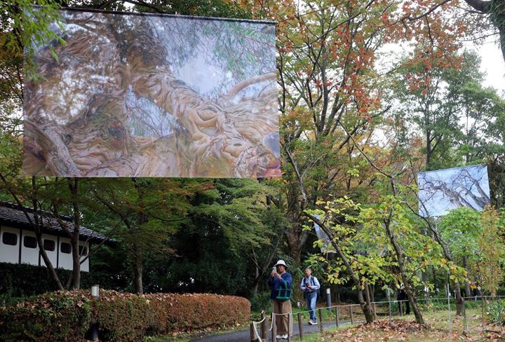 ノルウェーを拠点に活動するアーティストグループ「Jumoku」による被爆樹木を題材にした作品展が8日、広島市佐伯区の市植物公園で始まった。昨年から自国で開催しており、県内では初めて。30日まで。