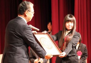 同コースを代表して贈呈式に出席したのは、2年江崎杏奈さん(17)、3年橋本一檎(いちご)さん(18)、3年中原雅さん(17)の3人。江崎さんは「絵を見た人が平和に向けて自分に何ができるかを考えて行動し、二度と原爆が落とされることがない世界になってほしい」と語った。