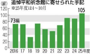 平和記念公園(広島市中区)にある国立広島原爆死没者追悼平和祈念館に本年度、被爆者たちから寄せられた手記が105編に達した。年100編を超えるのは2012年度以...