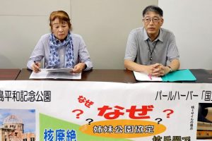 広島市中区の平和記念公園と米ハワイ州パールハーバー国立記念公園の姉妹公園協定を巡り、市民団体「広島・パールハーバーの協定撤回を求める会」は21日、撤回を訴える...